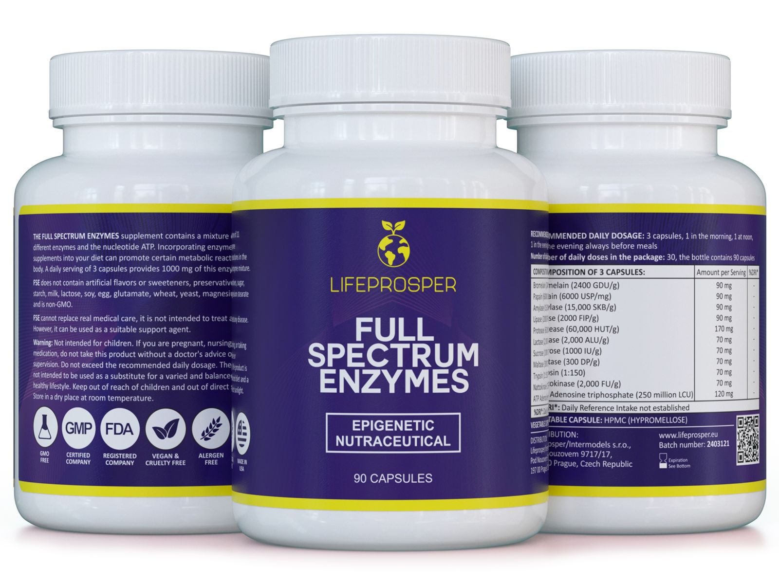 The FSE supplement contains a blend of 11 different enzymes and the nucleotide ATP. Incorporating enzyme supplements into your diet can support certain metabolic reactions in the body. A daily serving of 3 capsules provides 1000 mg of this enzyme blend.